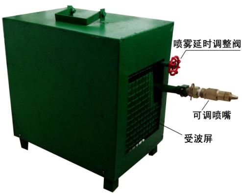 本裝置設(shè)計為一體化,有進(jìn)水閥門、噴霧時間調(diào)整閥門等組成,當(dāng)迎頭放炮時震動沖擊波沖擊機(jī)械放炮噴霧裝置的受波屏,進(jìn)水閥門打開,開始噴霧,同時水源又給進(jìn)水延時水箱注水,由于延時水箱與所配墜鐵比重偏移,水箱的水滿后,水箱逐漸傾斜并緩慢放水,從而逐漸減少噴霧延時時間,水箱的水流盡后,噴霧停止,直至下一次放炮,再次循環(huán)實(shí)現(xiàn)噴霧過程。噴霧延時水箱有進(jìn)水調(diào)整閥門,調(diào)整此閥門可調(diào)整噴霧時間。